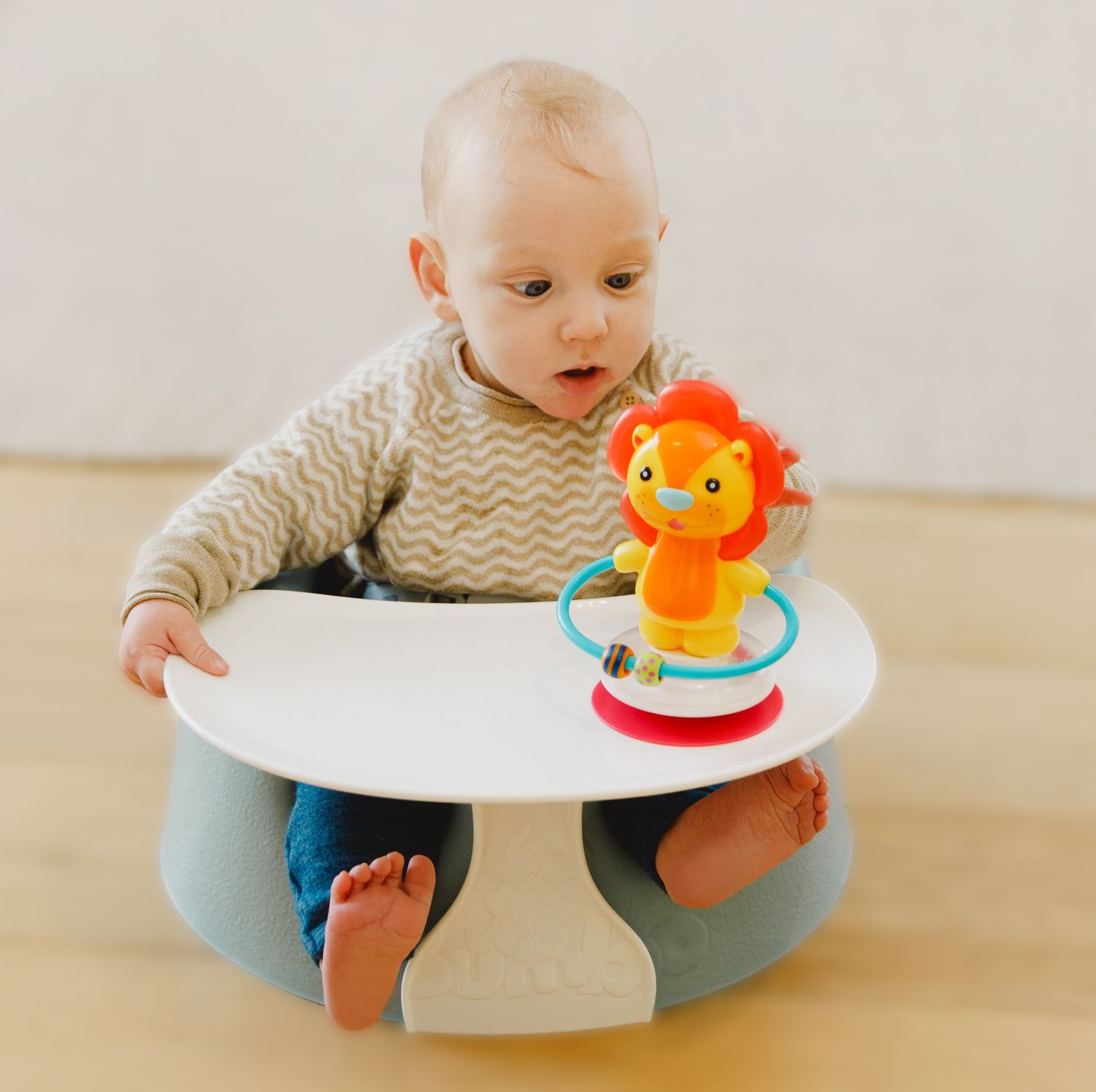 手の届くところにおもちゃや絵本が置けて赤ちゃんもご機嫌に。トレイの耐荷重は500gです。赤ちゃんの「すわる」をきちんと考えた世界中で愛されるバンボ