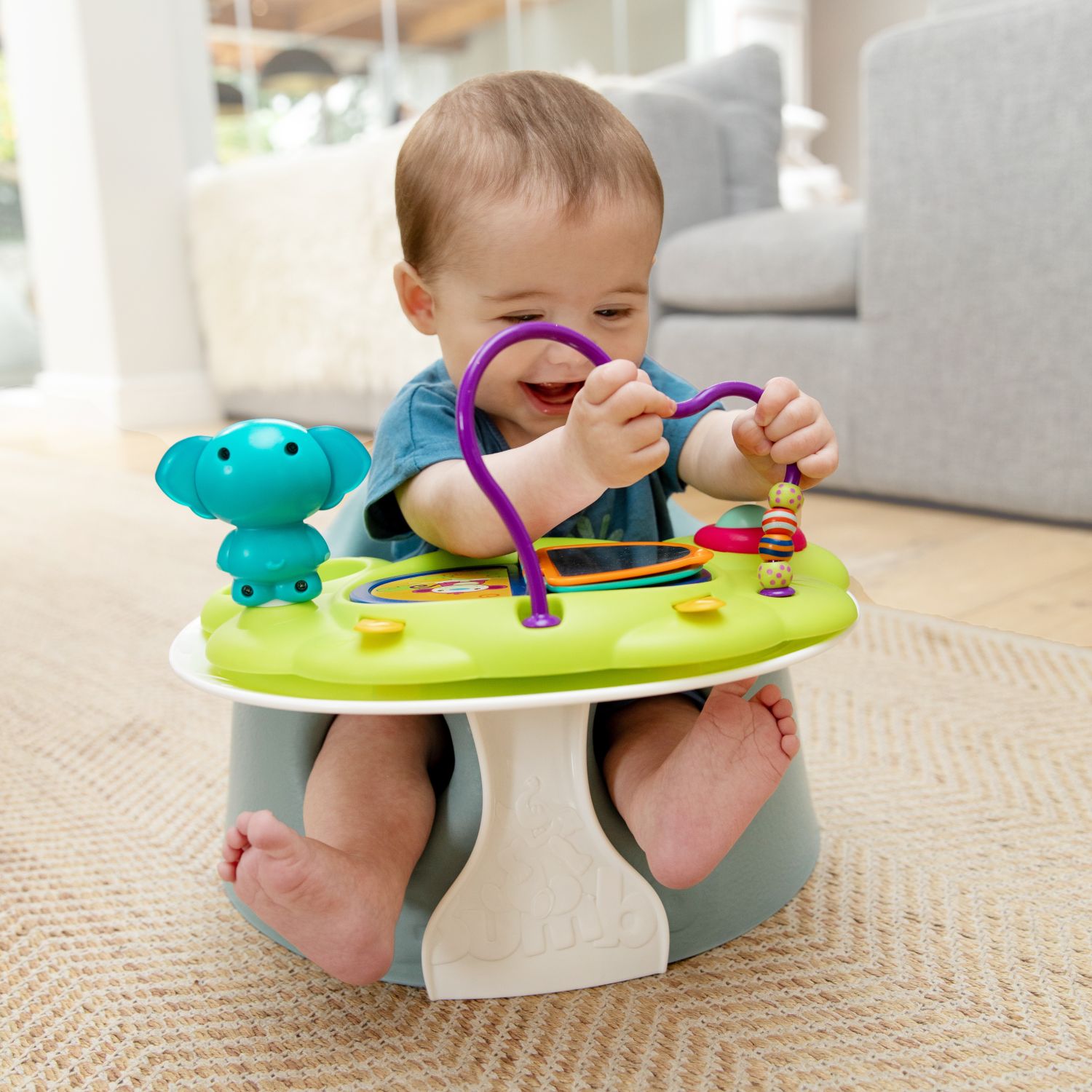 赤ちゃんが座るとオリジナルのバンボカーブが体に沿って背中やおしりを包み込み、はじめてのおすわりをサポートします。